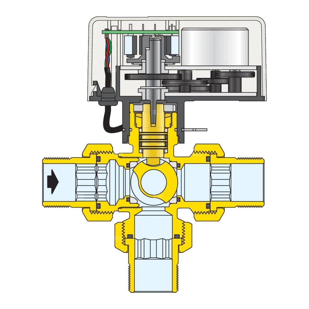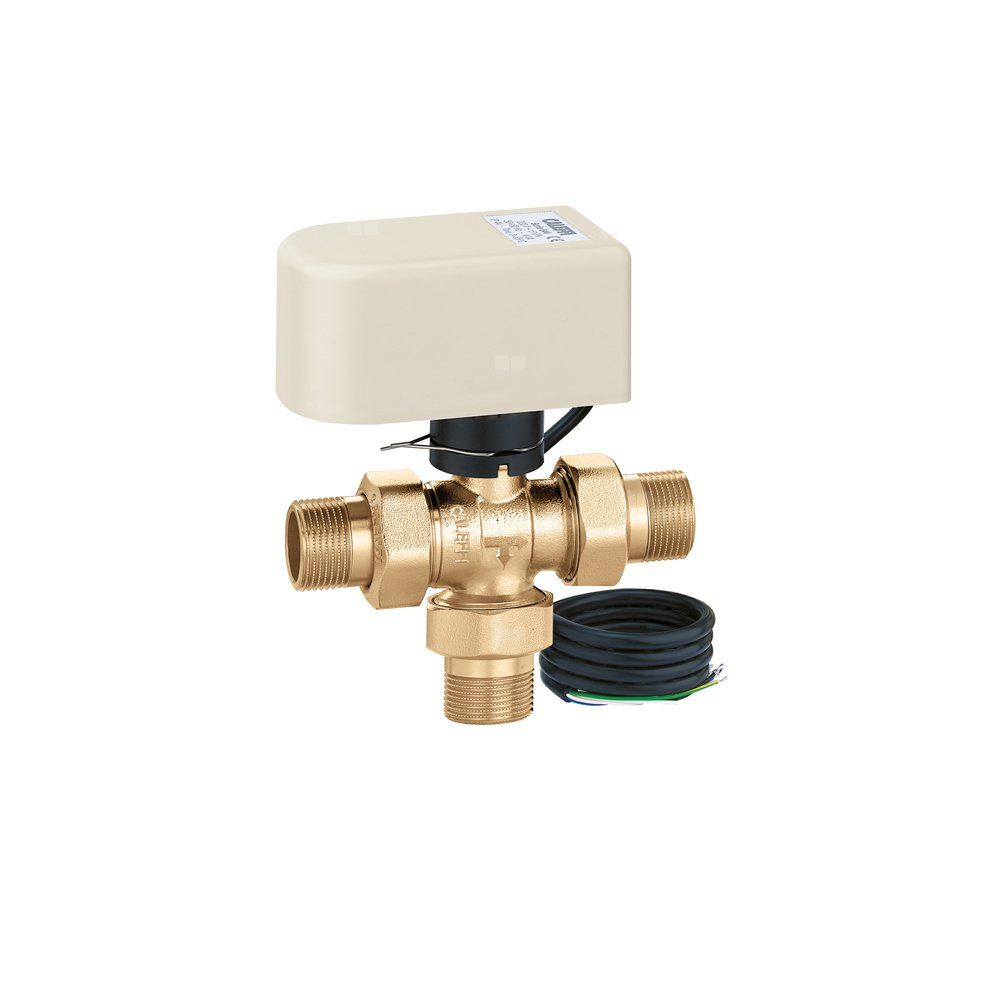Trójdrożny kulowy zawór strefowy z napędem, wersja z obejściem Z mikroprzełącznikiem pomocniczym W zestawie z siłownikiem ze sterowaniem 3-punktowym Przyłącze: G 1/2" A (ISO 228-1) GZ. Maksymalne ciśnienie pracy: 10 bar. Zakres temperatury medium: -5–110 °C. Zakres temperatury otoczenia: 0–55 °C. Zasilanie elektryczne: 24 V (AC). Pobór mocy: 4 VA. Stopień ochrony: IP 44 (w pozycji pionowej), IP 40 (w pozycji poziomej). Długość przewodu zasilająego: 1 m. Styk mikroprzełącznika pomocniczego (230 V): 0,8 A. △p max.: 10 bar. Kv przelot: 10,3 m³/h. Kv obejście: 1,8 m³/h. Czas zadziałania: 40 s (obrót 90°).