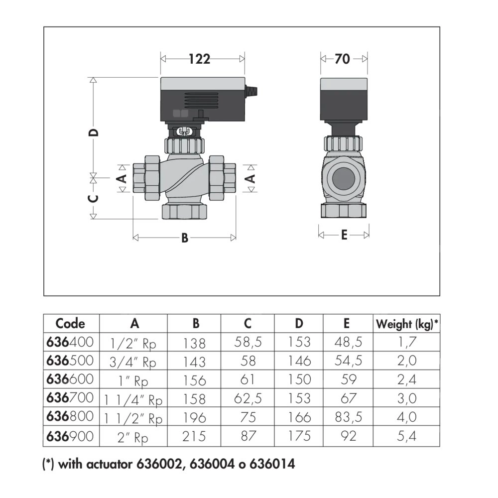 Dwudrożny zawór regulacyjny, gwintowany Charakterystyka stałoprocentowa. Przyłącze: Rp 2" (EN 10226-1) GW, złączka. Maksymalne ciśnienie pracy: 16 bar. Zakres temperatury medium: 0–100 °C. PN (Ciśnienie nominalne): PN 16. DN: DN 50 (korpus). Kv: 28 m³/h.