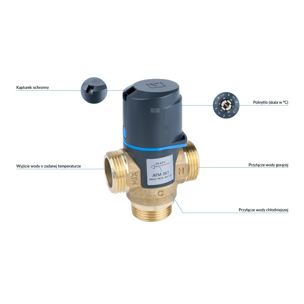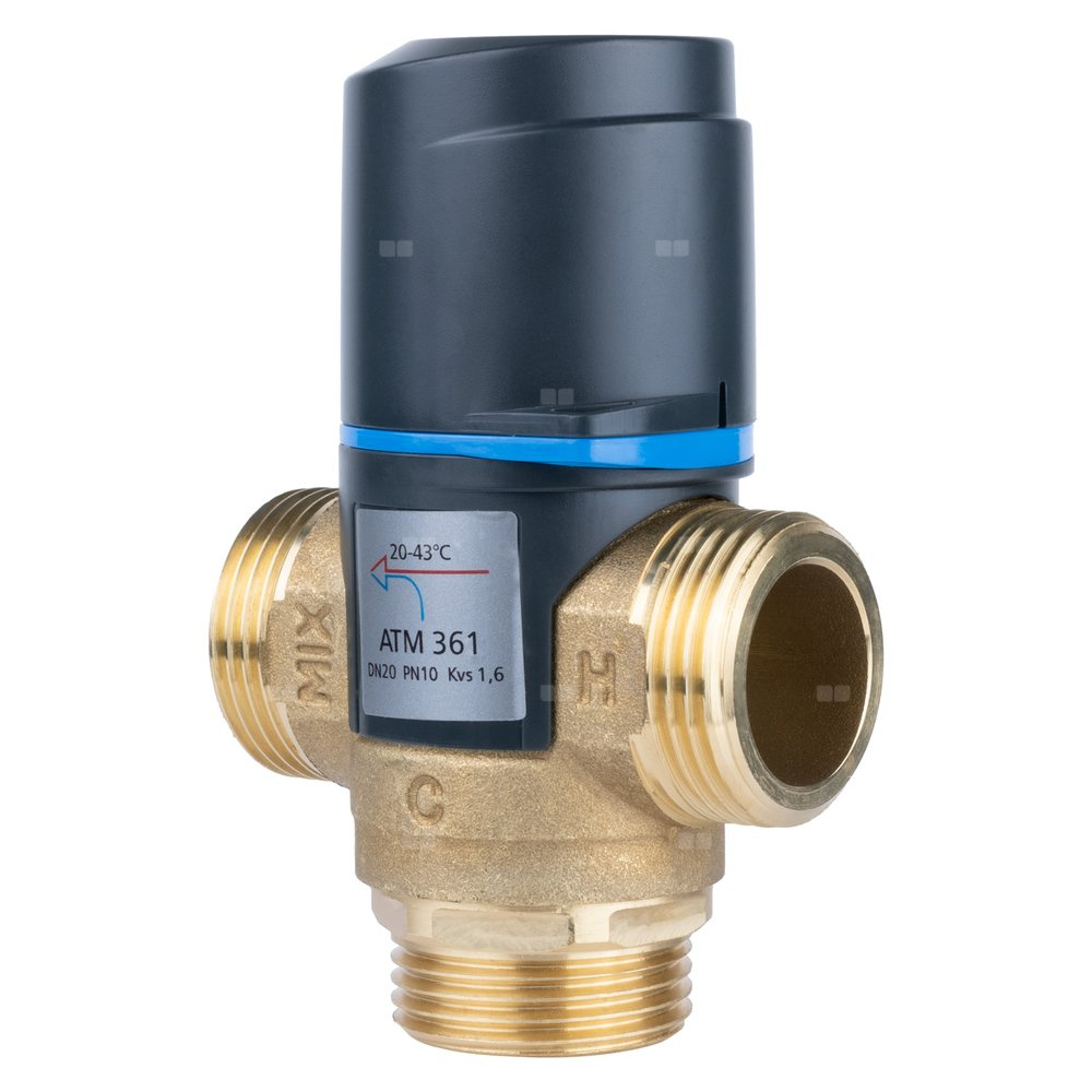 Zawór regulacyjny termostatyczny do wody ciepłej AFRISO ATM 361 mosiądz GZ 1'', DN 20, zakres temp. 20-43'C, Kvs 1.6 m3/h, maksymalna temperatura 90'C, maksymane ciśnienie 10 bar