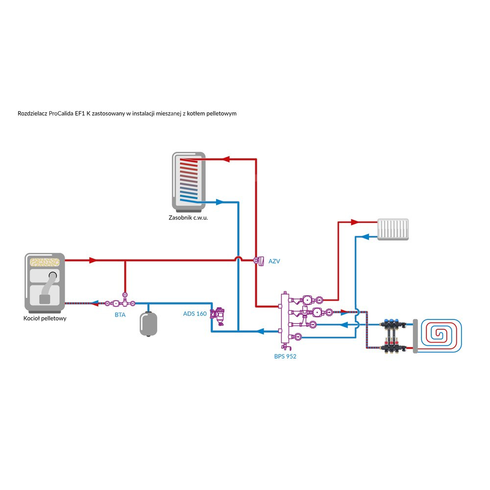 Rozprowadza ciepło / chłód ze źródła na poszczególne pętle instalacji płaszczyznowej.