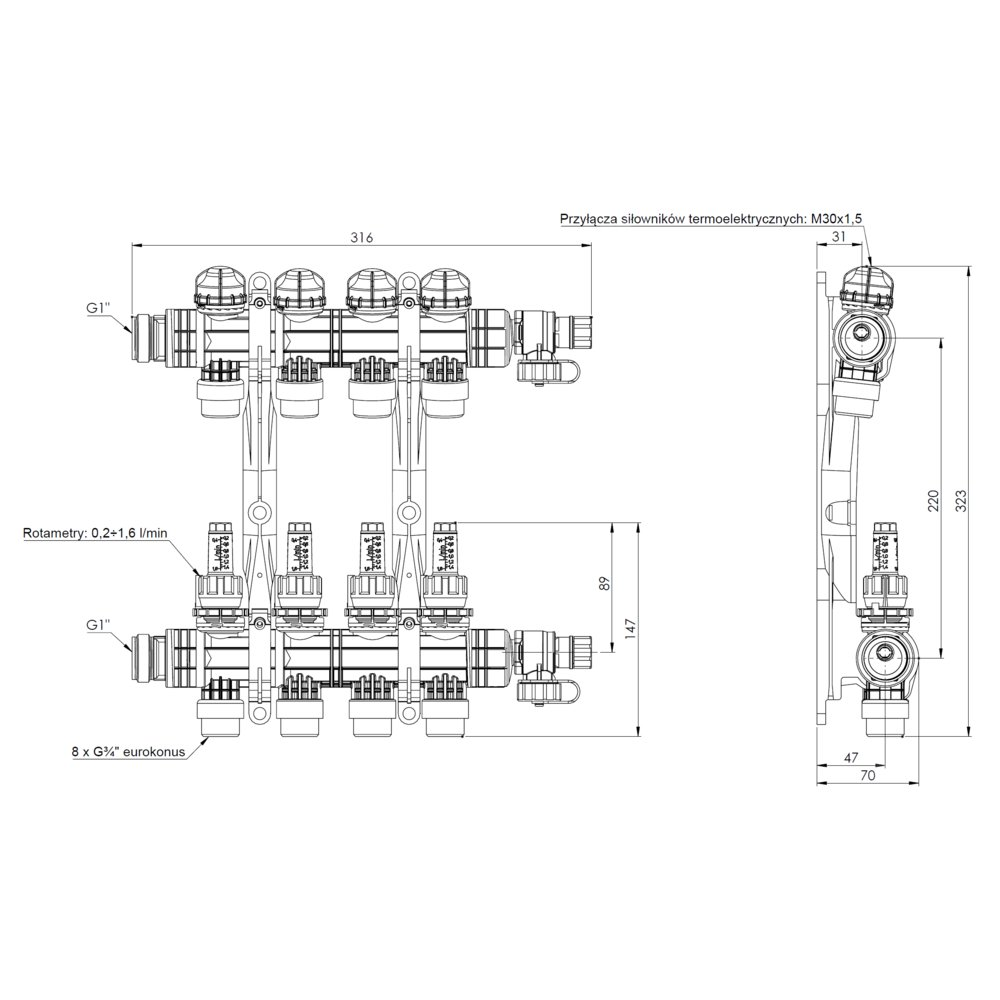 Na zaworach odcinających na belce powrotnej można zamontować siłowniki termoelektryczne (np. TSA-01) i podłączyć je do systemu sterowania strefowego (np. FloorControl, CosiTherm), co pozwoli ustawić różne temperatury w każdej ze stref.