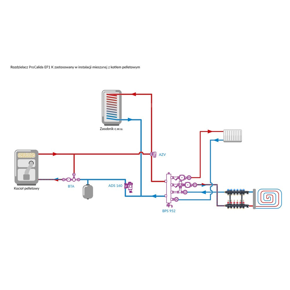 Rozprowadza ciepło / chłód ze źródła na poszczególne pętle instalacji płaszczyznowej.