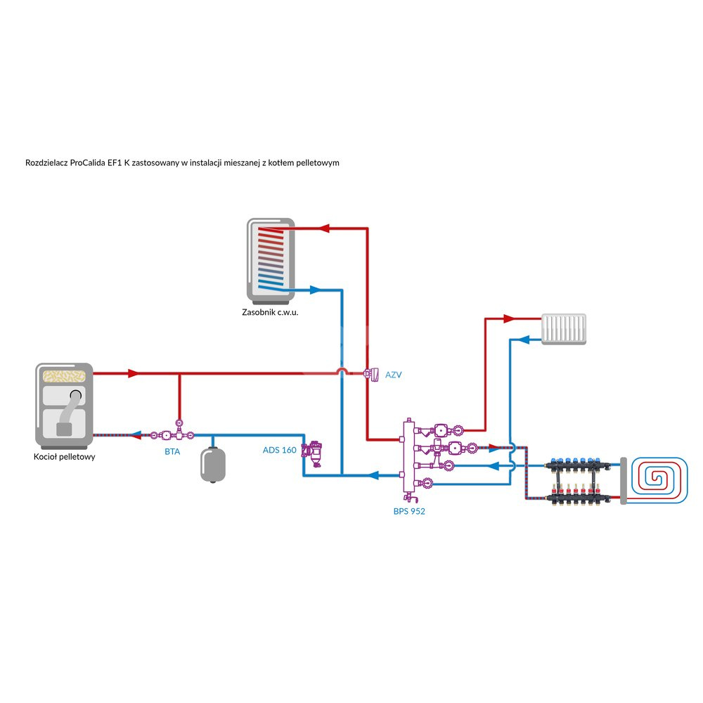Rozprowadza ciepło / chłód ze źródła na poszczególne pętle instalacji płaszczyznowej.