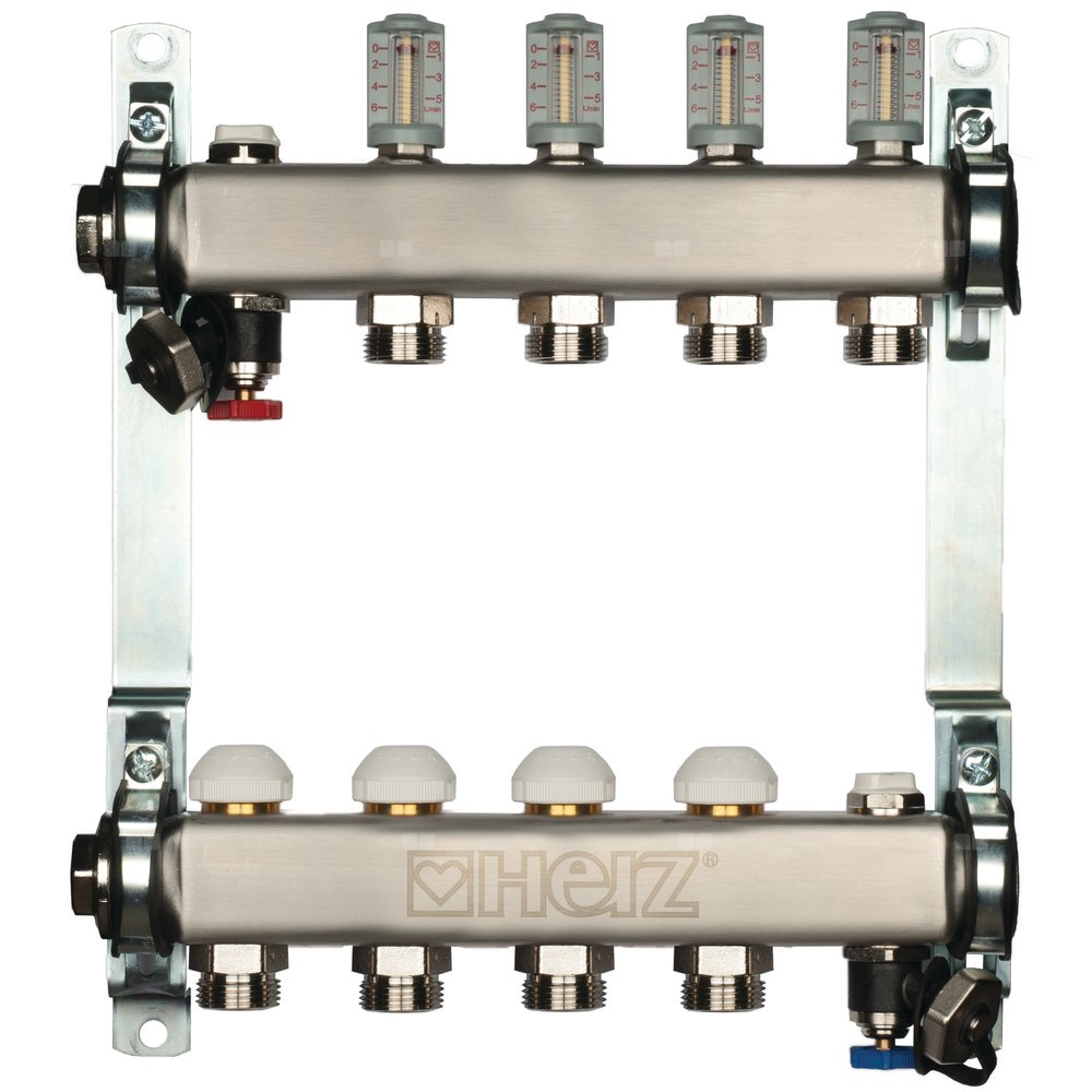 Rozdzielacz do ogrzewania podłogowego HERZ 5-obieg. stal nierdzewna GW 1'' x GZ 3/4'' + przepływomierz + zawór napełn/spust + odpowietrznik