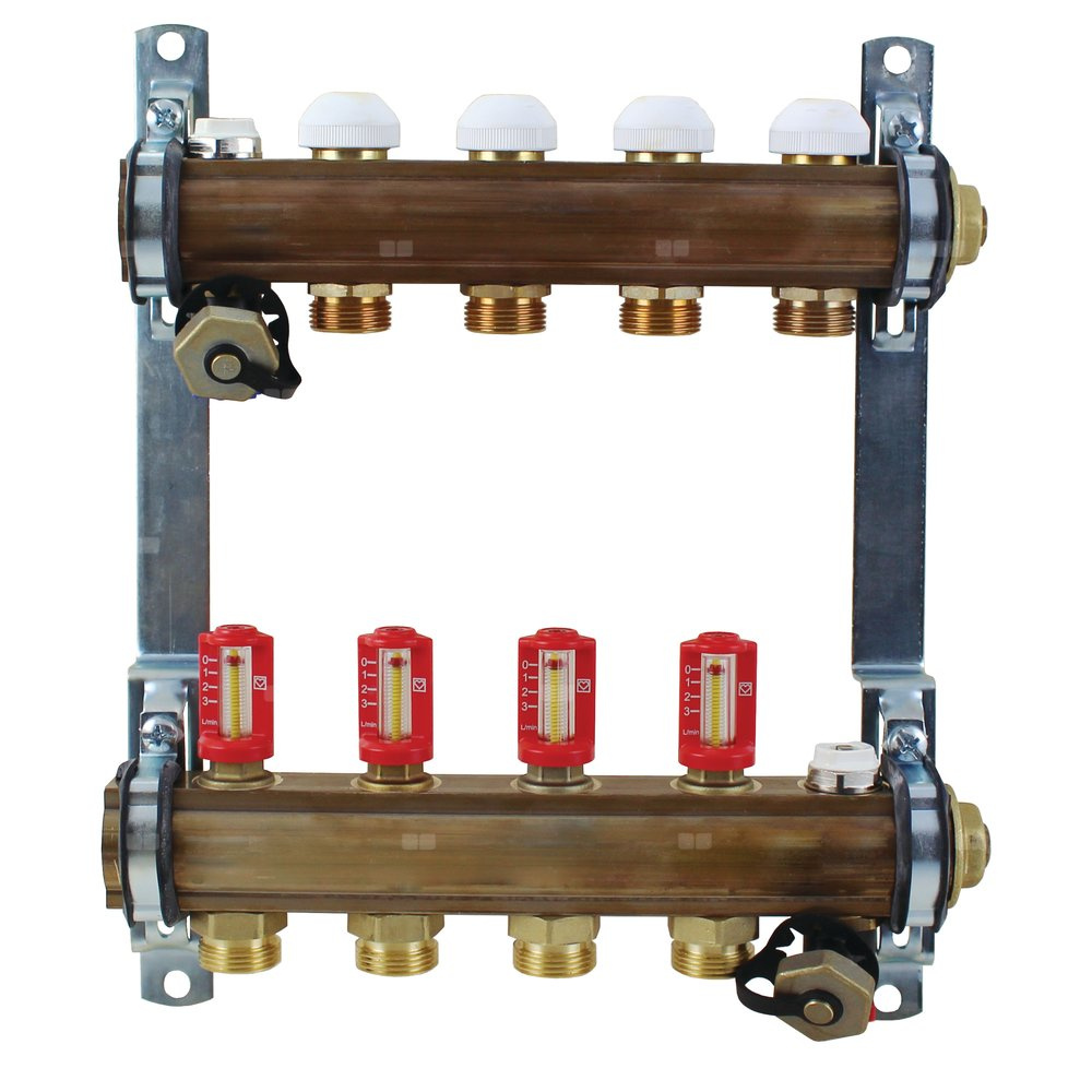 Rozdzielacz do ogrzewania podłogowego HERZ 8-obieg. mosiądz GW 1'' x GZ 3/4'' + przepływomierz + zawór napełn/spust + odpowietrznik