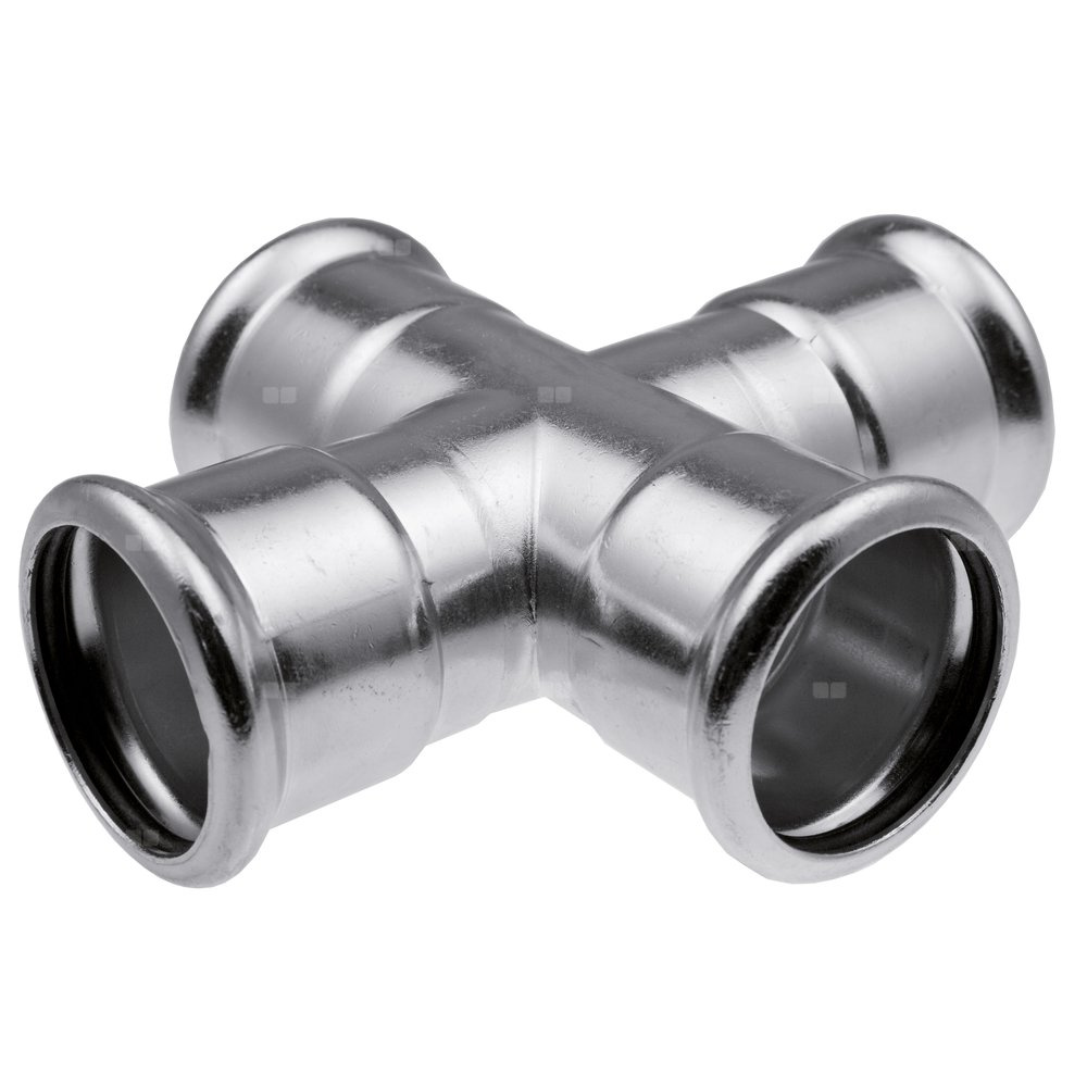 Czwórnik Steel 90° Steel w zakresie średnic 35 - 54 stalowy ocynkowany (Fe/Zn88), grubość warstwy 8-15 µm do połączeń zaprasowywanych z funkcją kontrolowanego przecieku LBP. Posiada uszczelnienie typu O-ring