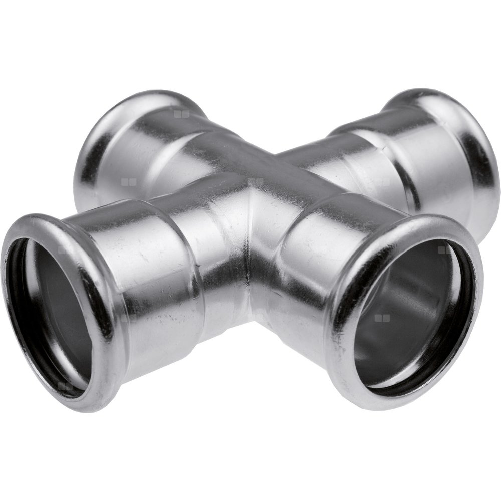 Czwórnik Steel 90° Steel w zakresie średnic 35 - 54 stalowy ocynkowany (Fe/Zn88), grubość warstwy 8-15 µm do połączeń zaprasowywanych z funkcją kontrolowanego przecieku LBP. Posiada uszczelnienie typu O-ring