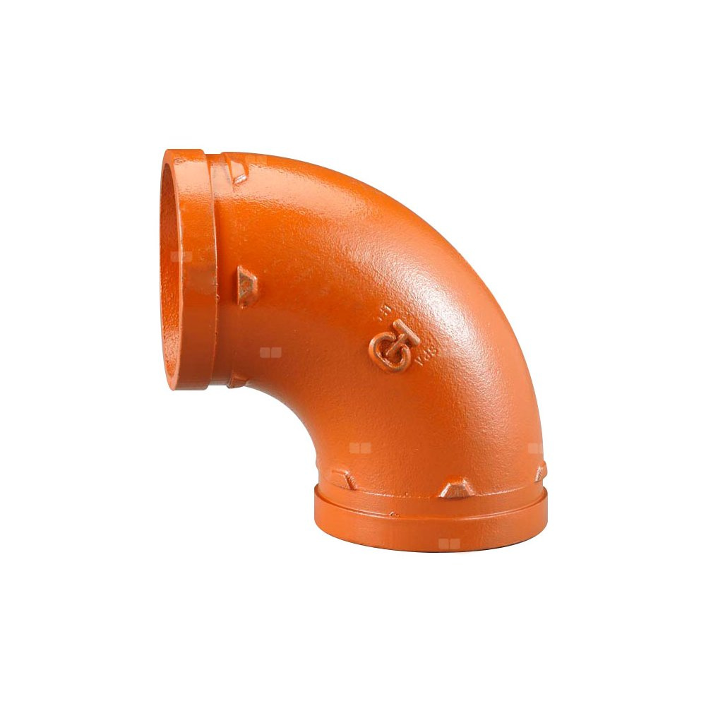Kolano 90° pomarańczowe Groove w zakresie średnic 33,7 (DN25) - 323,9 (DN300), 2 x rowek. Do zastosowania w instalacjach centralnego ogrzewania i chłodzenia, wody lodowej, sprężonego powietrza, a także w instalacjach PPOŻ tj. hydrantowych i tryskaczowych. System może być zastosowany także w instalacjach przemysłowych oraz rurociągach w górnictwie.