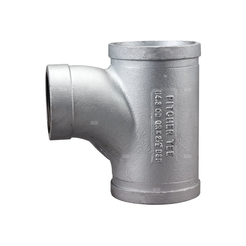 Trójnik ocynkowany łukowy Groove 114,3 (DN100) x Rp2½". 3 x rowek. Do zastosowania w instalacjach centralnego ogrzewania i chłodzenia, wody lodowej, sprężonego powietrza, a także w instalacjach PPOŻ tj. hydrantowych i tryskaczowych. System może być zastosowany także w instalacjach przemysłowych oraz rurociągach w górnictwie.