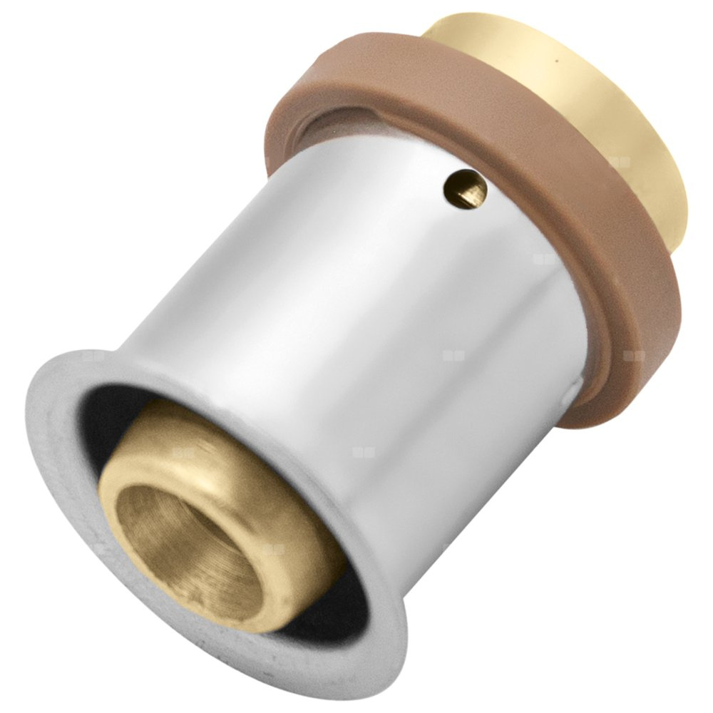 Zaślepka mosiężna (CW617N) ultraPRESS w zakresie średnic 16 - 32 do połączeń zaprasowywanych z rurami jednorodnymi i wielowarstwowymi, pierścień do zaprasowywania - stal nierdzewna, funkcja kontrolowanego przecieku LBP, pierścień identyfikujący średnicę, uszczelnienie O-ringowe EPDM;
