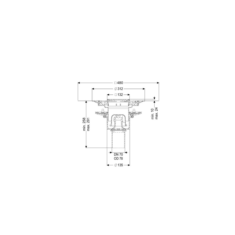 KESSEL Wpust obiek. Ecoguss doc.koł.usz., wielkość nominalna (DN) 70, dł. pokrywy 120 mm, króciec pionowy, syfonem w zestawie, odwodnienie przez odpływ punktowy, maks. wys. posadzki 24 mm, typ pokrywy Kratka design, regulowany w trzech wymiarach