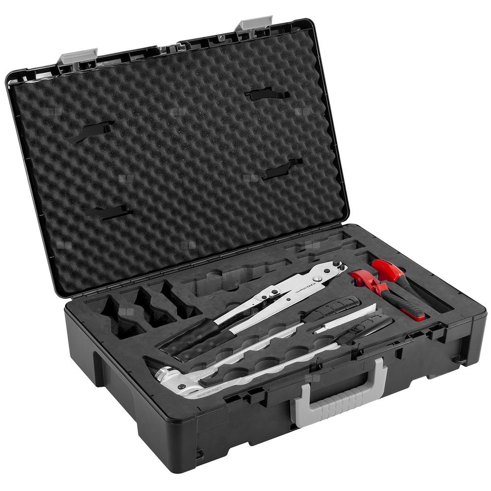 Komplet narzędzi ręcznych ultraLINE - kielichownica i praska łańcuchowa. Skład kompletu: praska łańcuchowa, kielichownica, smar do kielichownicy, nożyce do cięcia rur 14-25, nożyce do cięcia rur 14-32, walizka narzędziowa (tworzywo); głowice kielichujące i widelce należy dokompletować oddzielnie