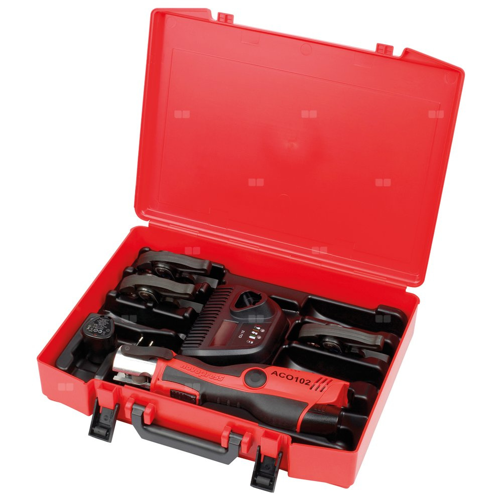 Komplet narzędzi - zaciskarka Novopress ACO103 BT + szczęki o profilu "U" ultraPRESS do średnic Ø16-32, zaciskarka akumulatorowa ACO103 - 1szt, szczęki U16 do zaciskarki, szczęki U20 do zaciskarki, szczęki U25 do zaciskarki, szczęki U32 do zaciskarki, ładowarka - 1szt, akumulator 2 Ah -2szt, walizka (tworzywo)