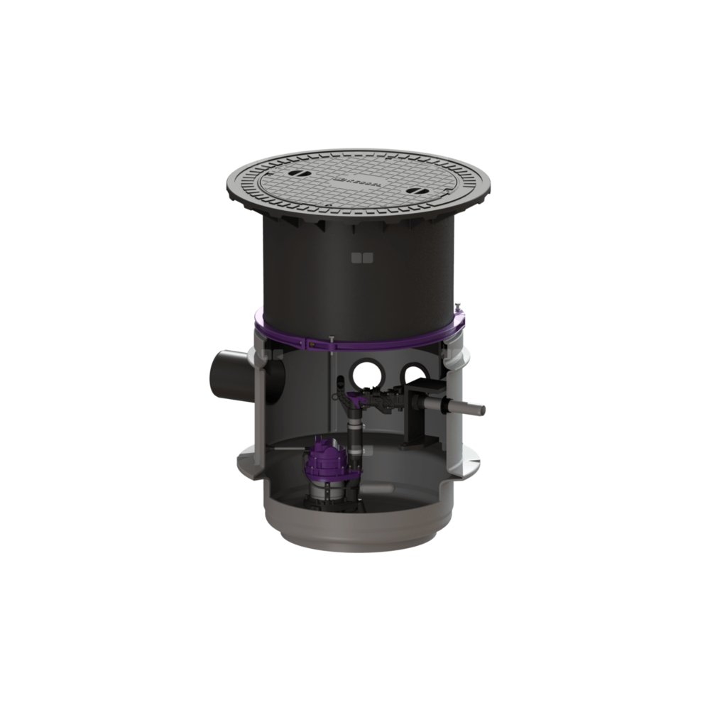 Przepompownia do ścieków zawierających fekalia jest przystosowana do zabudowy w ziemi i wyposażona w klapę zwrotną do przewodu tłocznego. Zbiornik z PE-LLD jest odporny na agresywne czynniki i może być dostarczony z pokrywami w klasie obciążenia A, B lub D. Pompa z mechanizmem rozdrabniającym zapewnia najwyższe bezpieczeństwo pracy. Komponenty są wstępnie zmontowane do montażu końcowego w miejscu instalacji. Z płaszczyznami na podłączenie odpowietrzenia i rury osłonowej na przewody elektryczne.