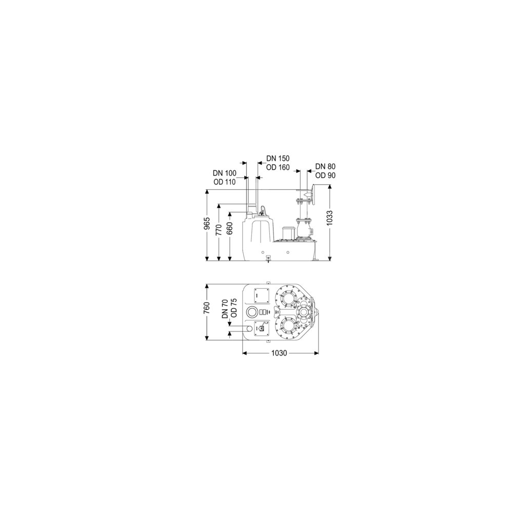KESSEL Przepompownia Aqualift F XL 200 l Duo, urządzenie dwupompowe, 400 V, zasuwa odcinająca Zasuwa odcinająca z żeliwa, z 2 SPF 5500 pomp zatapialnych, mata antywibracyjna tak, czujnik alarmu z Rura zanurzeniowa, typ pracy S3 - 30%, króciec tłoczny pionowy