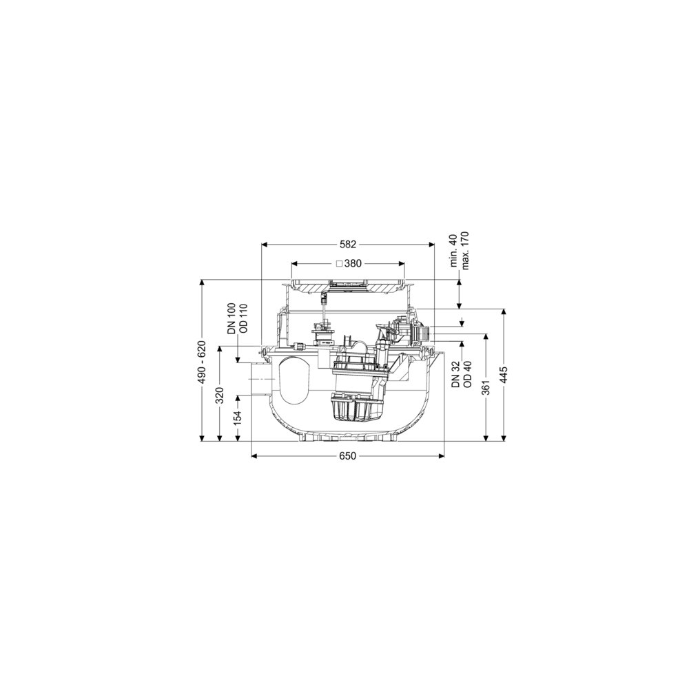 Gotowa do przyłączenia przepompownia do ścieków bez fekaliów jest wyposażony w jedną lub dwie pompy zatapialną oraz zawór zwrotny. Zbiornik wykonany z trwałego tworzywa sztucznego (PE) posiada otwartą komorę pompy. Zamknięcia jednoręczne umożliwiają łatwe wyjęcie zintegrowanych komponentów. Urządzenie do zabudowy w płycie podłogowej jest wstępnie zmontowane do montażu końcowego w miejscu instalacji.