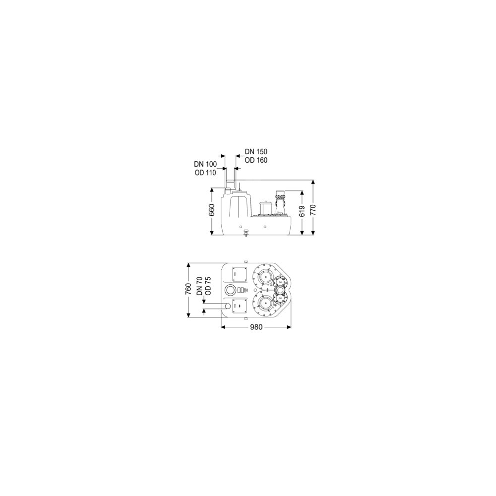 Przepompownia do ścieków zawierających fekalia i bez fekaliów jjest wyposażony w jedną lub dwie pompy zatapialną oraz zawór zwrotny. Pojemnik zbiorczy wykonany z wytrzymałego tworzywa sztucznego (PE) oferuje uniwersalne możliwości podłączenia i posiada przykręcany otwór wyczystkowy.