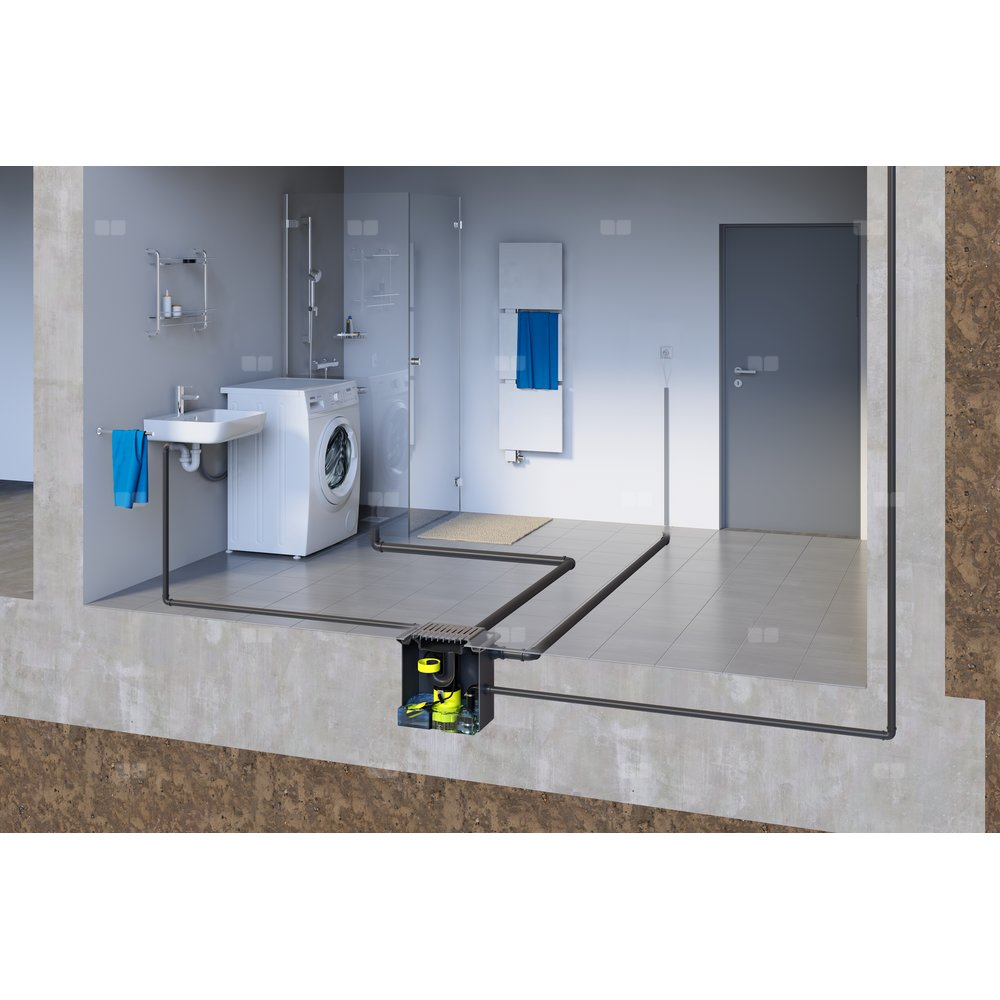 10 m ↑ przepompownia do wody szarej z kratką ściekową do montażu w płycie podłogowej. Zbiornik 20 L wyposażony w zatapialną pompę do wody brudnej 850W z włącznikiem pływakowy. Ruszt kratkowy z tworzywa sztucznego, po którym można chodzić, syfon i osadnik piasku. Max. wydajność 10 m3/h