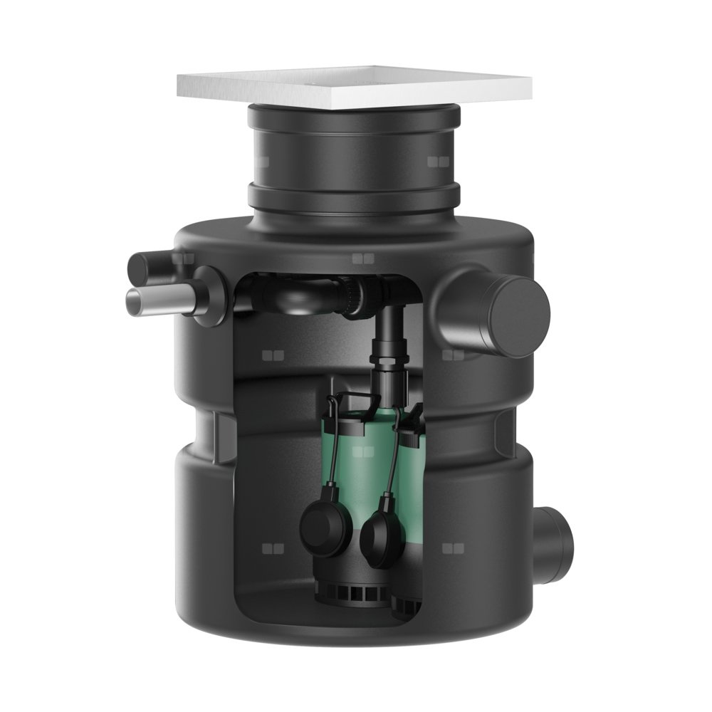 Gotowe do podłączenia, automatyczne urządzenie do przetłaczania ścieków w formie układu dwupompowego do instalacji podpowierzchniowej do tłoczenia ścieków bez fekaliów (zgodnie z normą EN 12050-2). Studzienka z tworzywa sztucznego z dwoma przyłączami dopływu, kompletne orurowanie z kształtką rozgałęźną, zabezpieczeniem przed przepływem zwrotnym i dwiema wstępnie zainstalowanymi pompami. Pompy zatapialne w wersji dla prądu zmiennego z samoczynnie włączaną termiczną kontrolą silnika i wbudowanym wyłącznikiem pływakowym do sterowania niezależnie od poziomu.