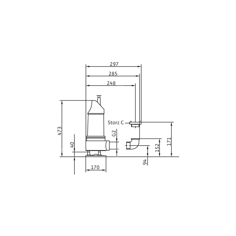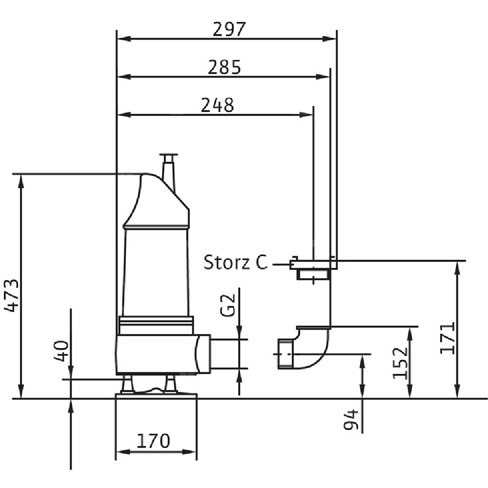 Całkowicie zanurzona pompa zatapialna do wody zanieczyszczonej, pionowe ustawienie mokre, do tłoczenia wody zanieczyszczonej i zawierającej piasek Korpus hydrauliczny i wirnik z żeliwa szarego, korpus silnika z aluminium. Przyłącze tłoczne z pionowym odpływem ciśnieniowym i złączem typu Storz. Samochłodzący silnik w wersji na prąd zmienny jednofazowy, z odłączanym kablem zasilającym i wtyczką z uziemieniem i kondensatorem roboczym. Do uszczelnienia po stronie medium i silnika służy uszczelnienie mechaniczne. Agregat można stosować w podsysającym trybie pracy bez ograniczeń.