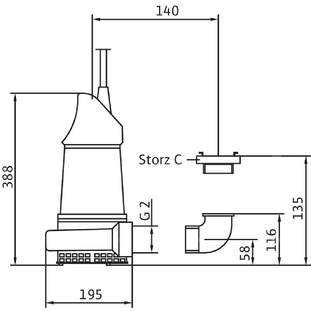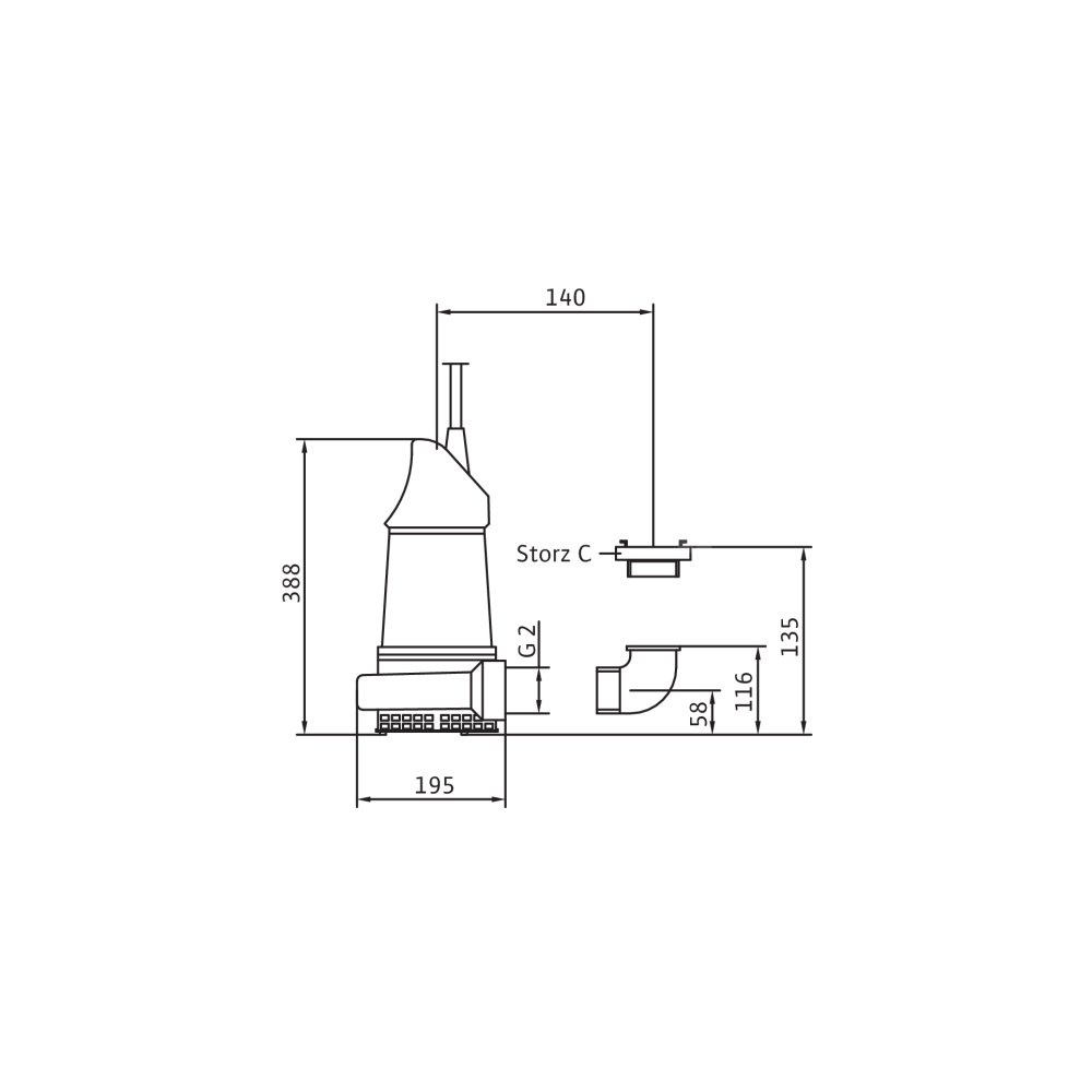 Całkowicie zanurzona pompa zatapialna do wody zanieczyszczonej, pionowe ustawienie mokre, do tłoczenia wody zanieczyszczonej i zawierającej piasek Korpus hydrauliczny i wirnik z żeliwa szarego, korpus silnika z aluminium. Przyłącze tłoczne z pionowym odpływem ciśnieniowym i złączem typu Storz. Samochłodzący silnik w wersji na prąd zmienny jednofazowy, z odłączanym kablem zasilającym i wyłącznikiem pływakowym z wtyczką z uziemieniem i kondensatorem roboczym. Do uszczelnienia po stronie medium i silnika służy uszczelnienie mechaniczne. Agregat można stosować w podsysającym trybie pracy bez ograniczeń.