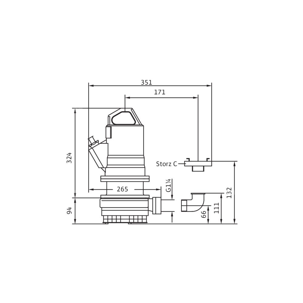 Całkowicie zanurzona pompa zatapialna do wody zanieczyszczonej, pionowe ustawienie mokre, do tłoczenia wody zanieczyszczonej i zawierającej piasek Wirnik, korpus hydrauliczny i silnika z żeliwa szarego. Przyłącze tłoczne z pionowym odpływem ciśnieniowym i złączem typu Storz. Silnik chłodzony powierzchniowo w wersji na prąd trójfazowy z komorą uszczelnienia, termiczną kontrolą silnika i certyfikatem Ex. Kabel zasilający z wodoszczelnym na całej długości wpustem i wolną końcówką. Do uszczelnienia po stronie medium i silnika służy uszczelnienie mechaniczne. Agregat można stosować poza strefami zagrożenia wybuchem w podsysającym trybie pracy bez ograniczeń.