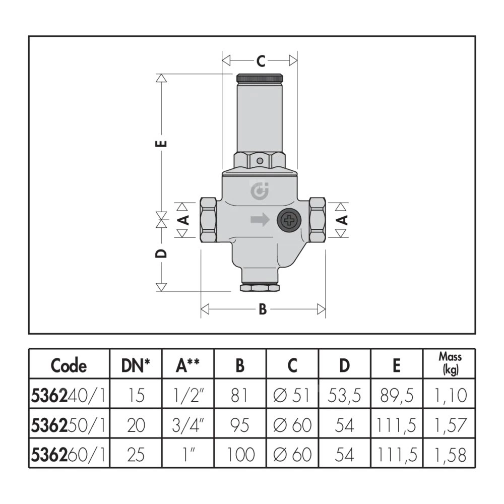 Regulator ciśnienia z wymiennym wkładem. Przyłącza z gwintem wewnętrznym. Przyłącze: G 1/2" (ISO 228-1) GW. Maksymalne ciśnienie wlotowe: 25 bar. Zakres temperatury medium: 2–80 °C. Zakres regulowanego ciśnienia: 0,5–6 bar. Materiał: stop mosiądzu odporny na odcynkowanie.