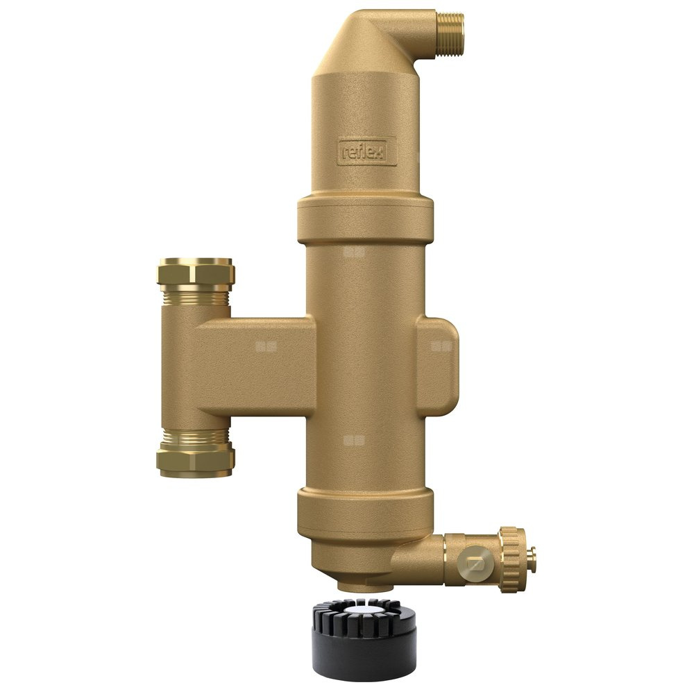 Dwufunkcyjny separator mikropęcherzy powietrza, zanieczyszczeń i osadów do instalacji grzewczych i chłodniczych oraz innych zamkniętych instalacji, w których czynnikiem są płyny. Zastosowanie do wody oraz mieszaniny wody z glikolem o stosunku do 50/50%.