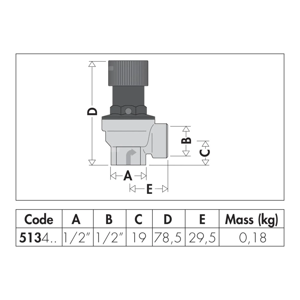 Zawór bezpieczeństwa, przyłącza z gwintem wewnętrznym. Nastawy: 1,5 -2 -2,5 - 3 -3,5 - 5 - 6 - 7 - 8 bar Ciśnienie otwarcia: + 20% ustawionego Ciśnienie zamknięcia: - 20% ustawionego Przyłącze: G 1/2" (ISO 228-1) GW. Zakres temperatury medium: 5–110 °C. Nastawa: 3 bar. PN (Ciśnienie nominalne): PN 10.