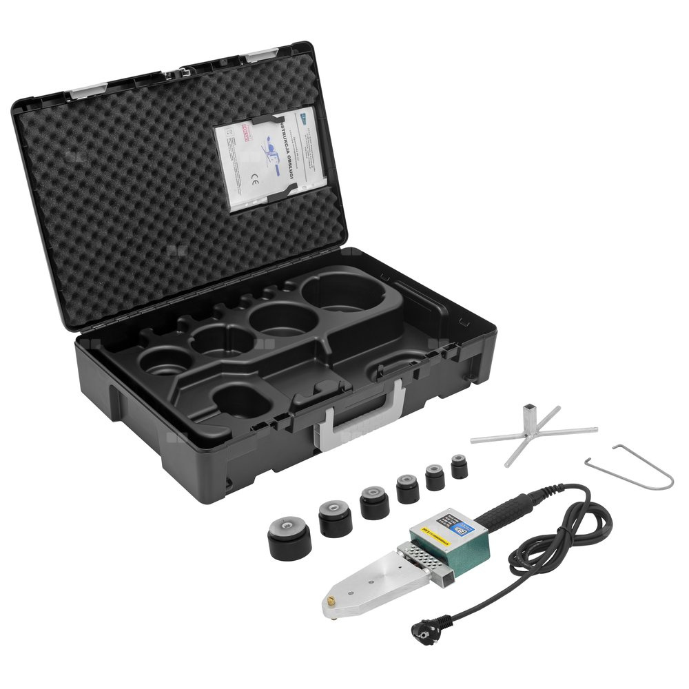 Komplet zgrzewający PP-R do średnic 16-50, 800 W; 63-110,1600 W: zgrzewarka sieciowa 800W lub 1600W, stojak do zgrzewarki, śruba do mocowania wkładów grzewczych, walizka (metal), komplet wkładów grzewczych 16-50mm lub 63-110mm. Komplet nie zawiera wkładów grzewczych do złączek siodełkowych