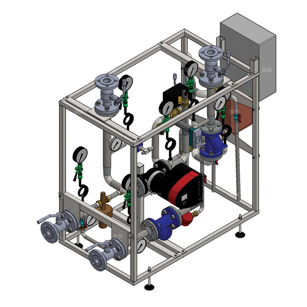 Składa się z: spawanych zaworów odcinających po stronie sieciowej, połączenia gwintowane armatury, zaworu regulacyjnego, siłownika ze sprężyną powrotną, pompy typu Magna, regulatora pogodowego, termometrów, manometrów, zaworu bezpieczeństwa, termostatu bezpieczeństwa, izolacji prostych odcinków przewodów i wymiennika, ręcznego układu uzupełniania zładu, naczynia wzbiorczego. Zabudowa w ramie stalowej. Gwarancja 12 miesięcy.
