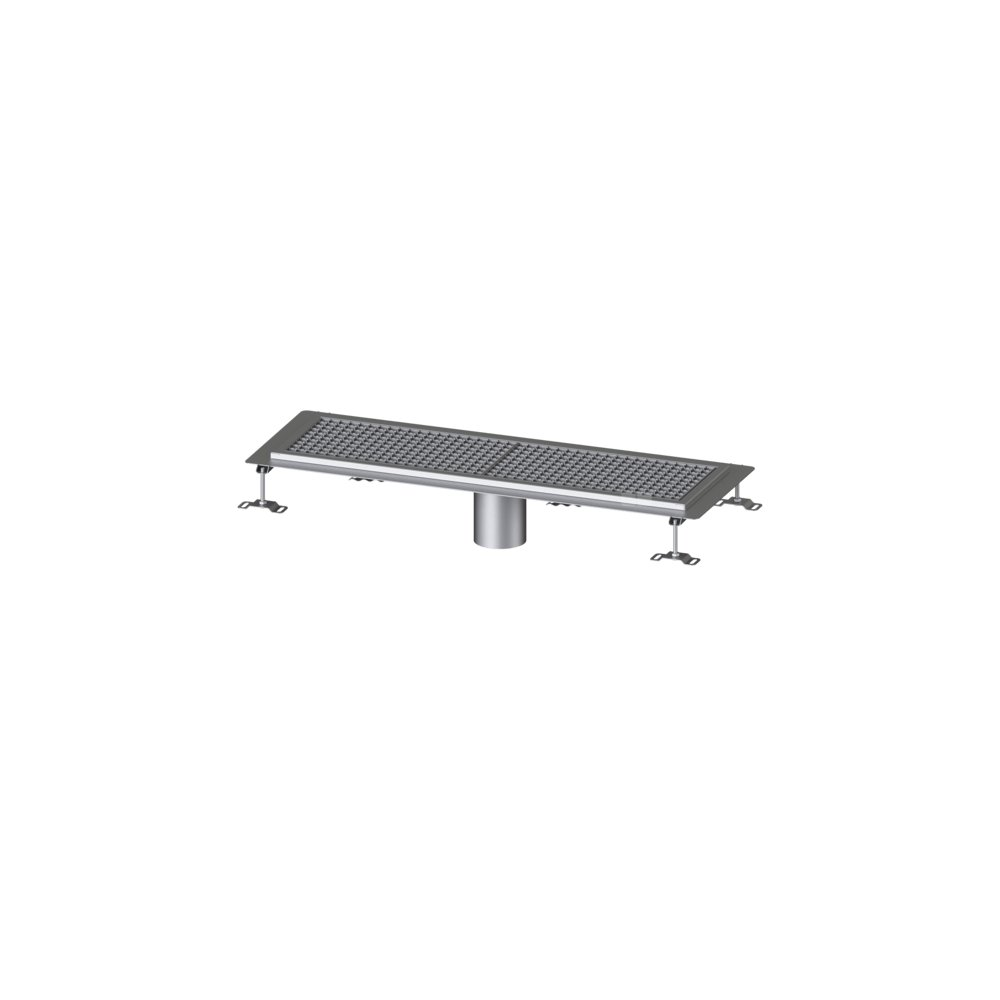 Odpływ szczelinowy Ferrofix z blachy ze stali nierdzewnej o grubości 2,0 mm (wytrawiany zanurzeniowo) posiada widoczne elementy szlifowane, spadek podłużny i poprzeczny, nóżki do poziomowania wysokości, dospawane poprzeczki dystansowe do zabezpieczenia rusztów oraz króciec odpływowy ze stali nierdzewnej.