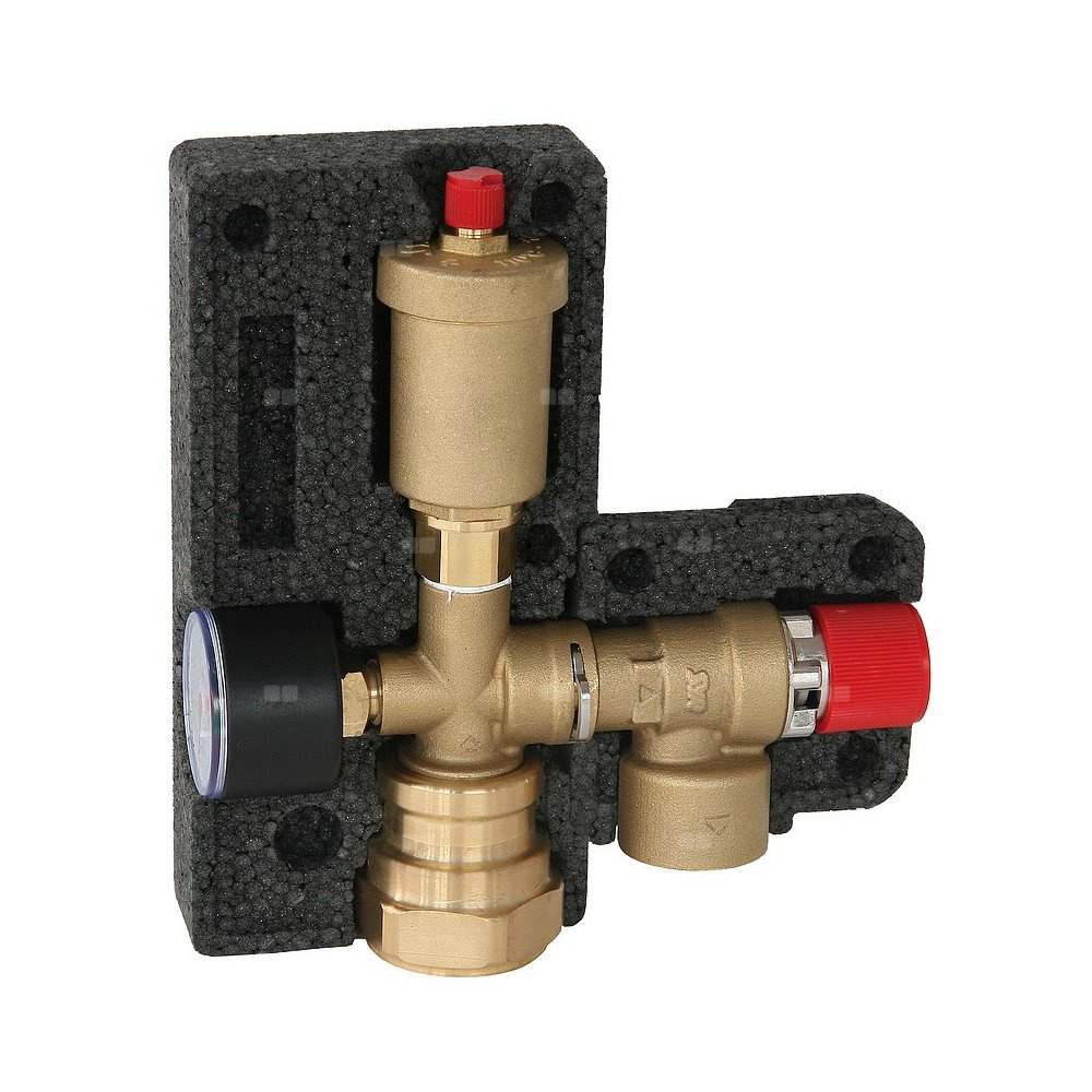Kompaktowa armatura zabezpieczająca kocioł składa się z membranowego zaworu bezpieczeństwa, automatycznego zaworu odpowietrzającego z zaworem stopowym, manometru i izolacji termicznej.