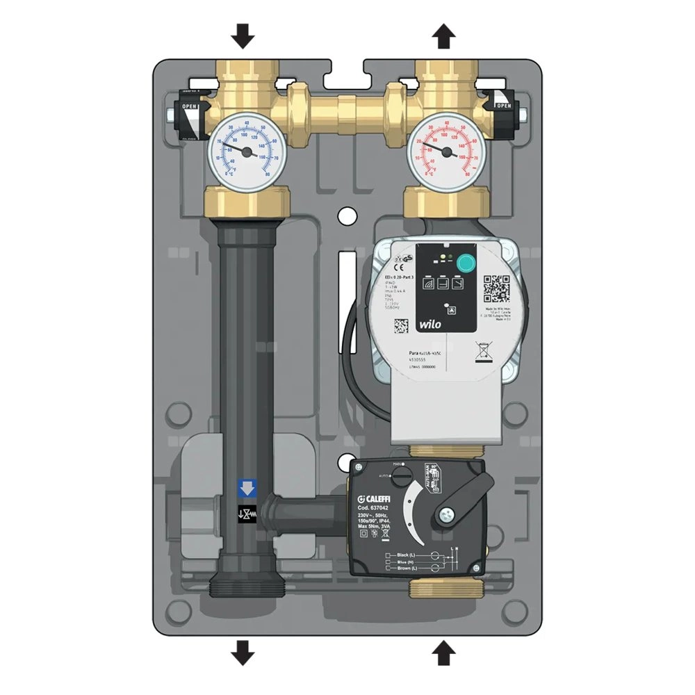 Grupa pompowa z trójdrogowym zaworem mieszającym z siłownikiem dla instalacji grzewczych i chłodniczych.