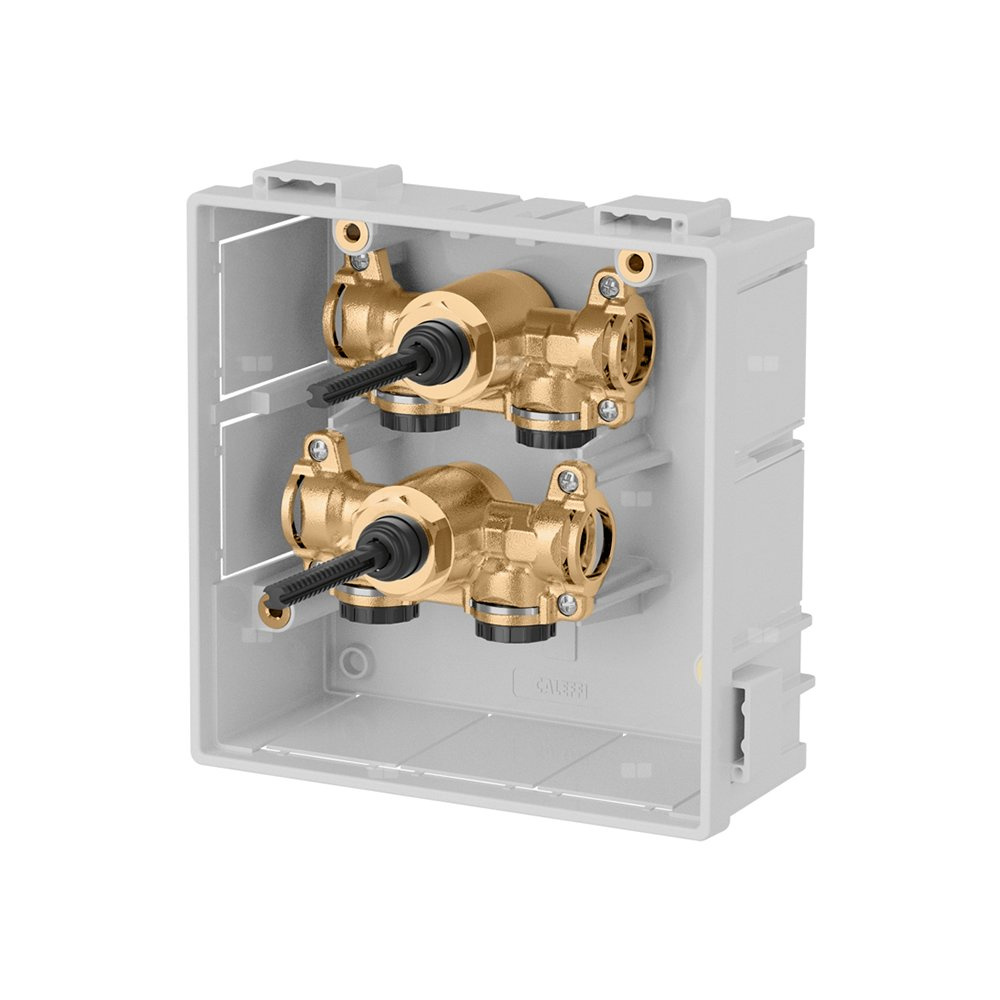 Grupa z zaworami odcinającymi Zawiera: -grupę zaworów; -skrzynkę rozdzielacza (190 x 190 x 80 mm) wyposażoną we wsporniki i elementy mocujące; -pokrywę zabezpieczającą w trakcie montażu; -4 zaślepki z klipsami mocującymi. Maksymalne ciśnienie pracy: 10 bar. Zakres temperatury medium: 5–90 °C. Materiał: mosiądz.