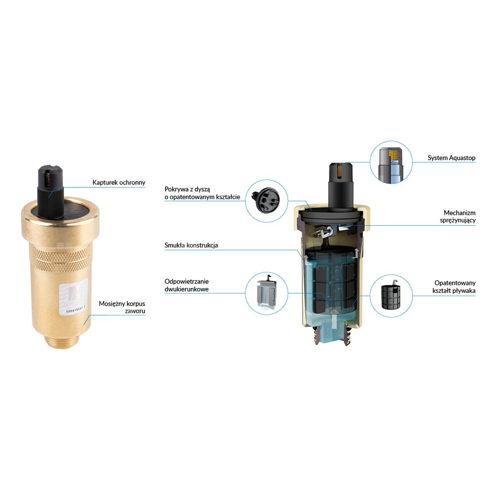 Opcjonalnie można wyposażyć go w zawór stopowy, który umożliwia łatwą wymianę i konserwację odpowietrznika bez konieczności spuszczania medium z instalacji.