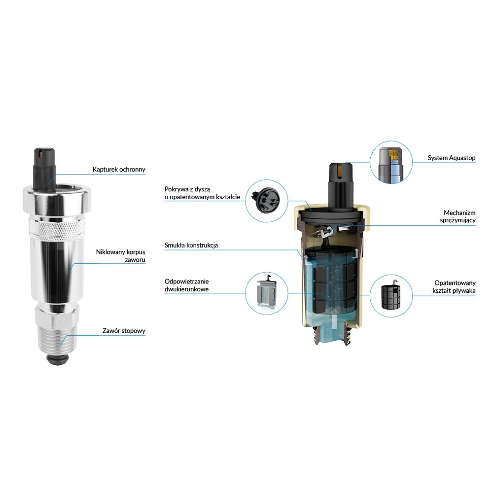 Zawór stopowy umożliwia łatwą wymianę i konserwację odpowietrznika bez konieczności spuszczania medium z instalacji.