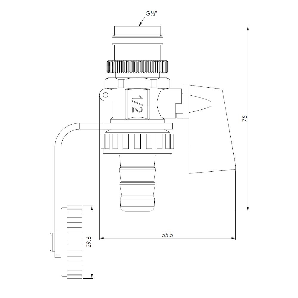 Z drugiej strony zaworu znajduje się przyłącze do węża giętkiego oraz zaślepka z uszczelką przymocowaną na gumowej opasce.