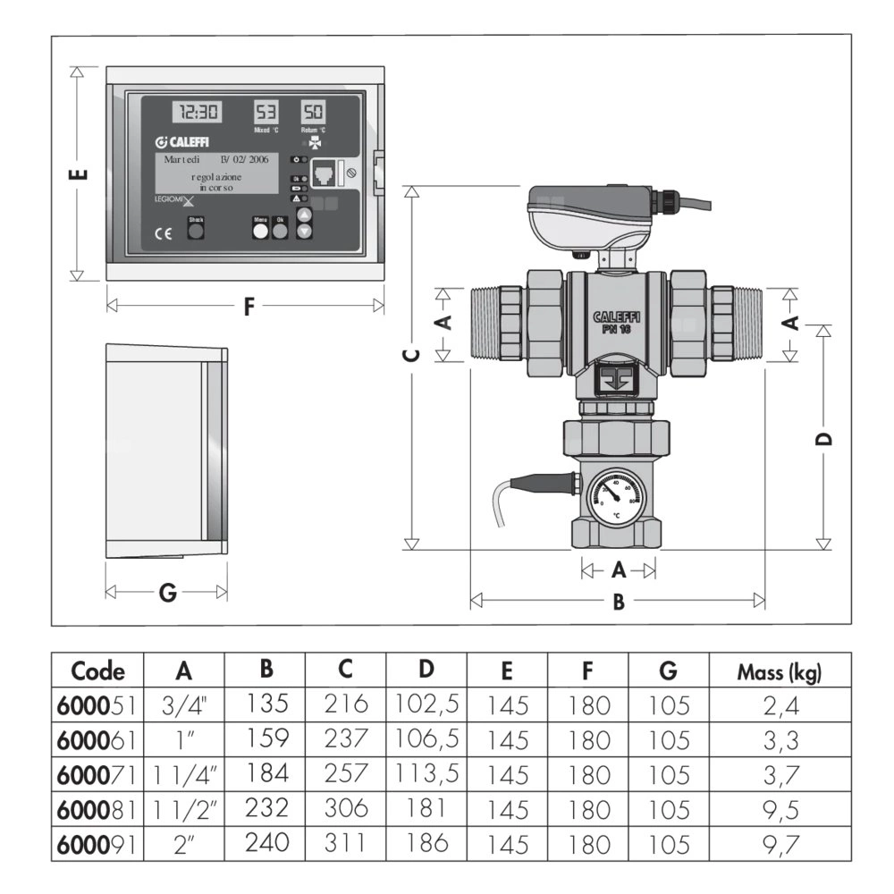 Elektroniczny zawór mieszający z programowalną dezynfekcją termiczną i dezynfekcją kontrolną 230 V. Przyłącza z gwintem zewnętrznym ze złączkami. Z mikroprzełącznikiem pomocniczym Zawiera: -trójdrożny zawór kulowy; -siłownik; -regulator; -czujnik temperatury wody zmieszanej; -czujnik temperatury wody cyrkulacyjnej. Przyłącze: R 3/4" (EN 10226-1) GZ, wlot, złączka. Przyłącze: G 3/4" (ISO 228-1) GW, wylot. Maksymalne ciśnienie pracy: 10 bar. Zakres temperatury medium: 0–100 °C. Zakres regulacji temperatury: 20–85 °C. Zakres temperatury dezynfekcji: 40–85 °C. Zasilanie elektryczne: 230 V (AC). Pobór mocy: (6,5+6) VA. Stopień ochrony: IP 65. Kv: 8,4 m³/h.