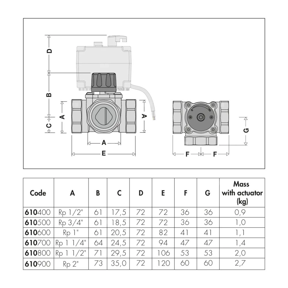 Trójdrożny zawór mieszający, gwintowany Ustawienie fabryczne: zasilanie ze źródła ciepła z prawej strony. Maksymalne ciśnienie pracy: 10 bar. Zakres temperatury medium: 5–110 °C. PN (Ciśnienie nominalne): PN 10. △p max.: 1 bar. Kv: 4 m³/h. Materiał: mosiądz.