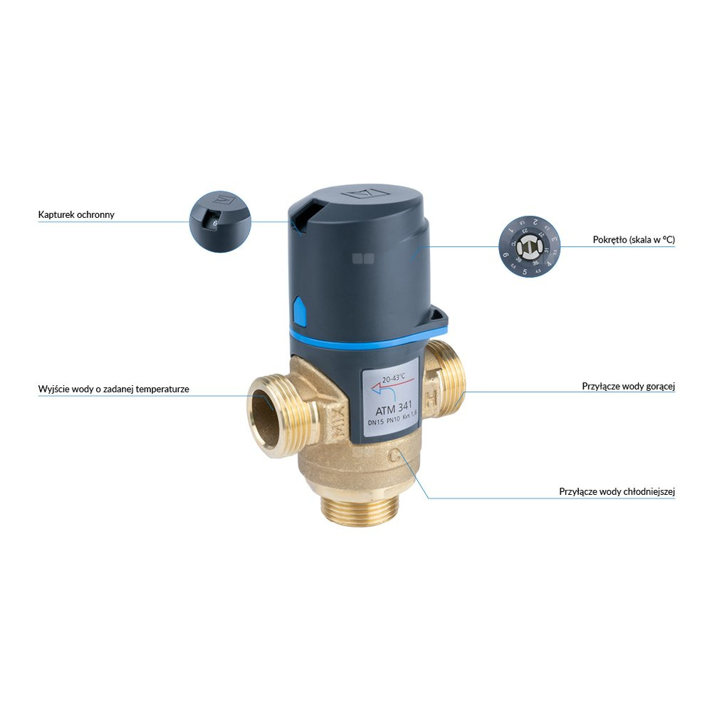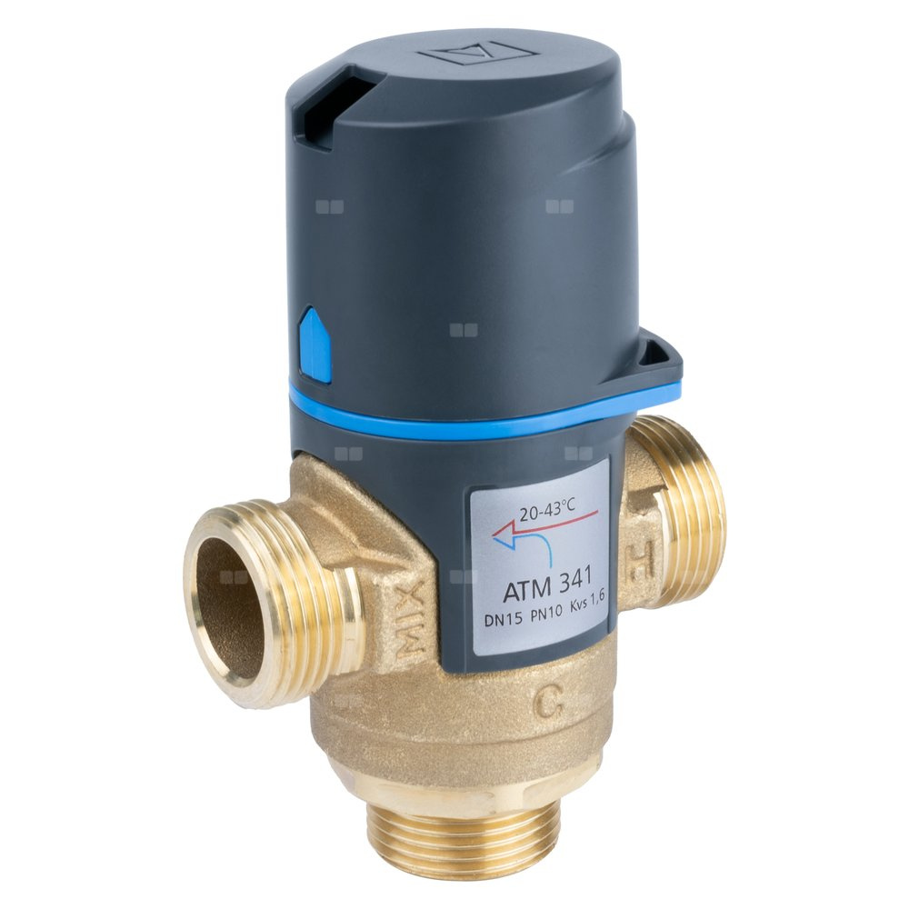 Zawór regulacyjny termostatyczny do wody ciepłej AFRISO ATM 341 mosiądz GZ 3/4'', DN 15, zakres temp. 20-43'C, Kvs 1.6 m3/h, maksymalna temperatura 90'C, maksymane ciśnienie 10 bar