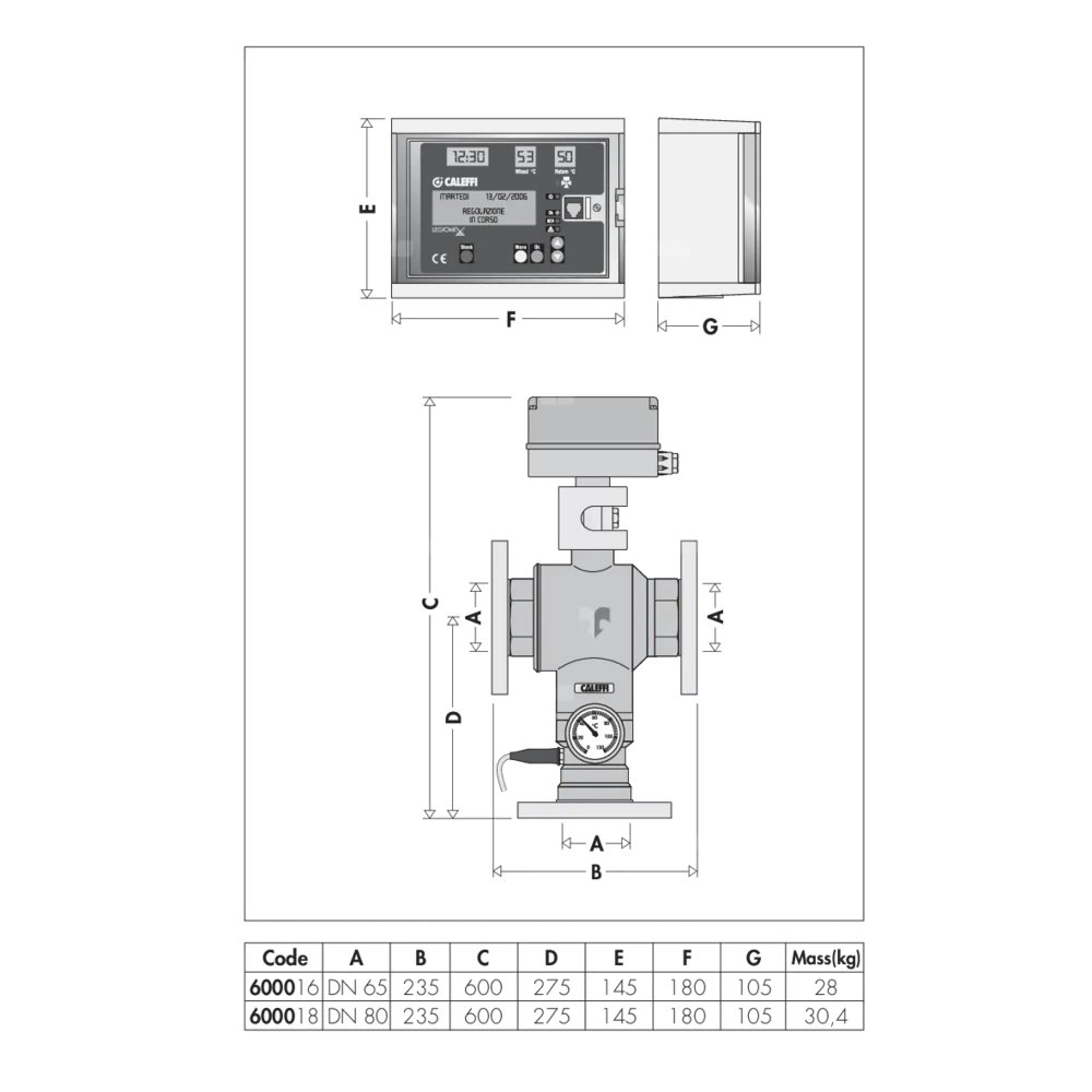 Elektroniczny zawór mieszający z programowalną dezynfekcją termiczną i dezynfekcją kontrolną 24 V. Przyłącza kołnierzowe PN 16. Z mikroprzełącznikiem pomocniczym Zawiera: -trójdrożny zawór kulowy; -siłownik; -regulator; -czujnik temperatury wody zmieszanej; -czujnik temperatury wody cyrkulacyjnej. Przyłącze: DN 65 (EN 1092-1) PN 16. Maksymalne ciśnienie pracy: 10 bar. Zakres temperatury medium: 0–100 °C. Zakres regulacji temperatury: 20–85 °C. Zakres temperatury dezynfekcji: 40–85 °C. Zasilanie elektryczne: 24 V (AC). Pobór mocy: (6,5+10,5) VA. Stopień ochrony: IP 65. DN: DN 65 (korpus). Kv: 90,0 m³/h.