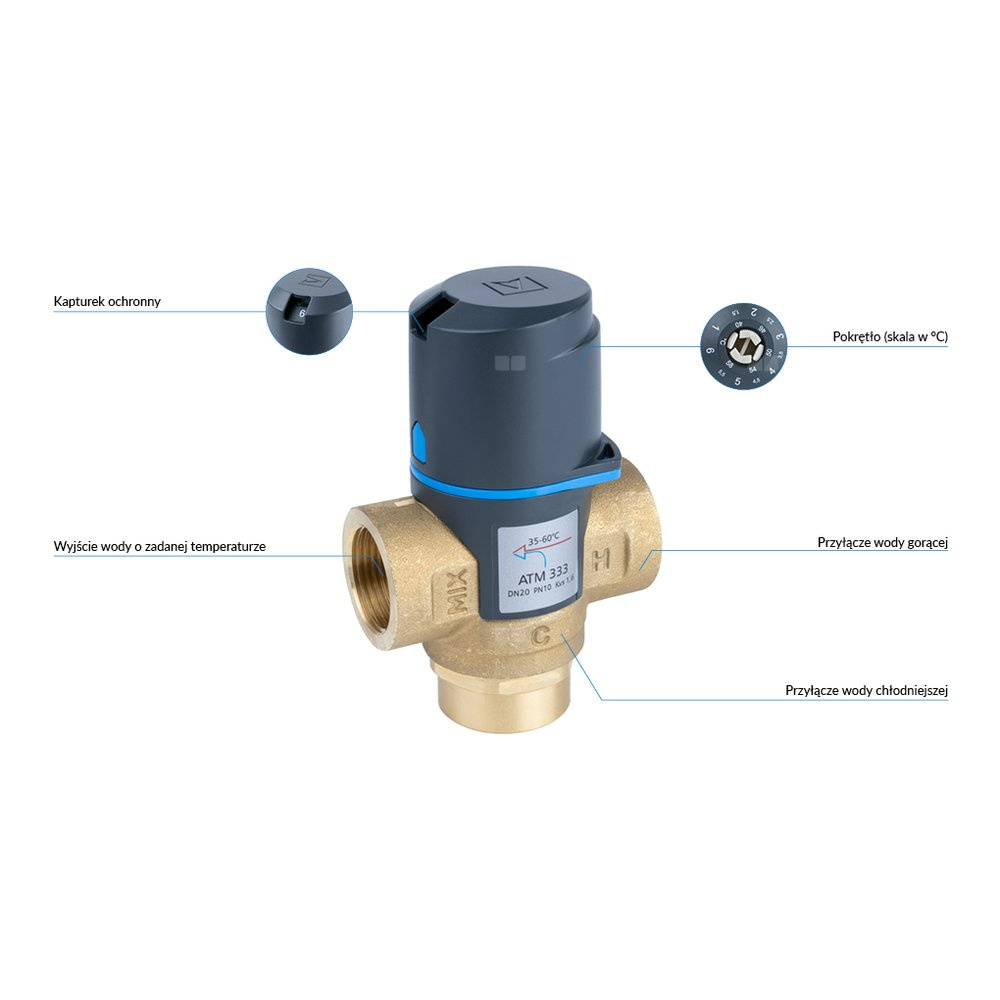 Zawór regulacyjny termostatyczny do wody ciepłej AFRISO ATM 333 mosiądz GW 3/4'', DN 20, zakres temp. 35-60'C, Kvs 1.6 m3/h, maksymalna temperatura 90'C, maksymane ciśnienie 10 bar