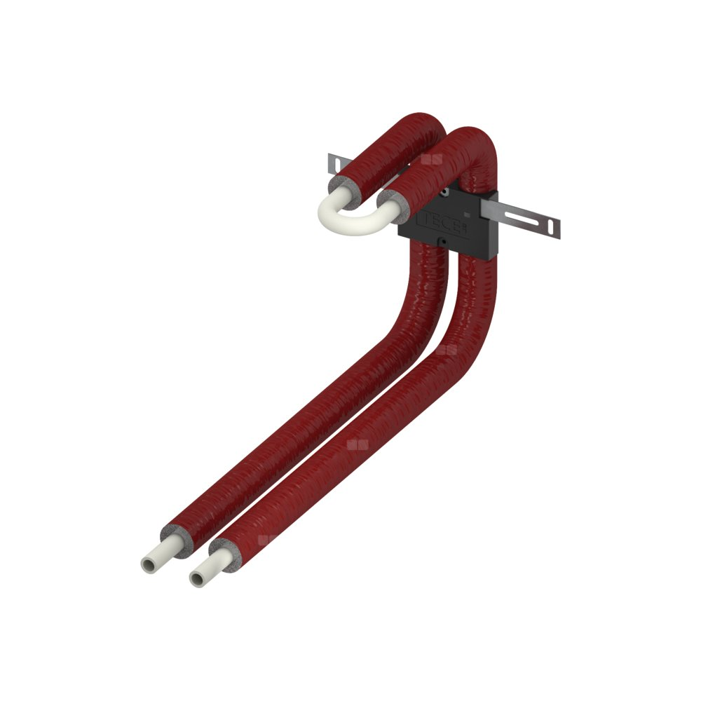 Garnitur montażowy z wyjściem ze ściany do kompaktowego grzejnika z wbudowanym zaworem, rura wielowarstwowa TECEflex rozmiar 16 mm, izolacja 9 mm, λR 0.040 W/(mK), umożliwia stabilne zamocowanie rury, rozstaw zaworu grzejnikowego 50 mm. Wysokość montażowa 210 mm.