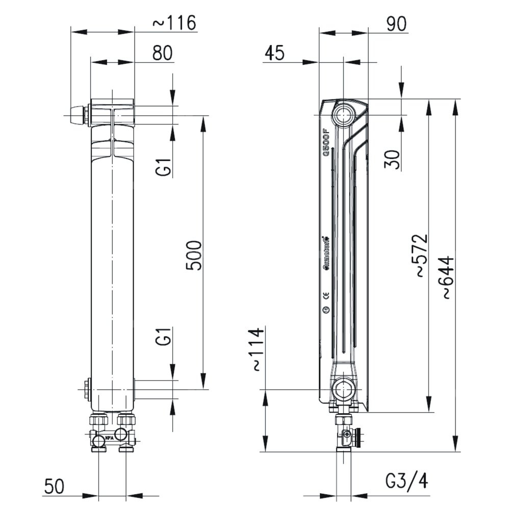 Grzejnik żeberkowy KFA Armatura G500F/D/1 aluminium, podłączenie dolne, lewe, proste 572 x 80 mm, kolor biały (RAL 9016)