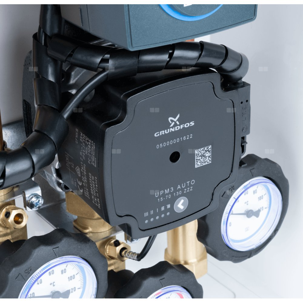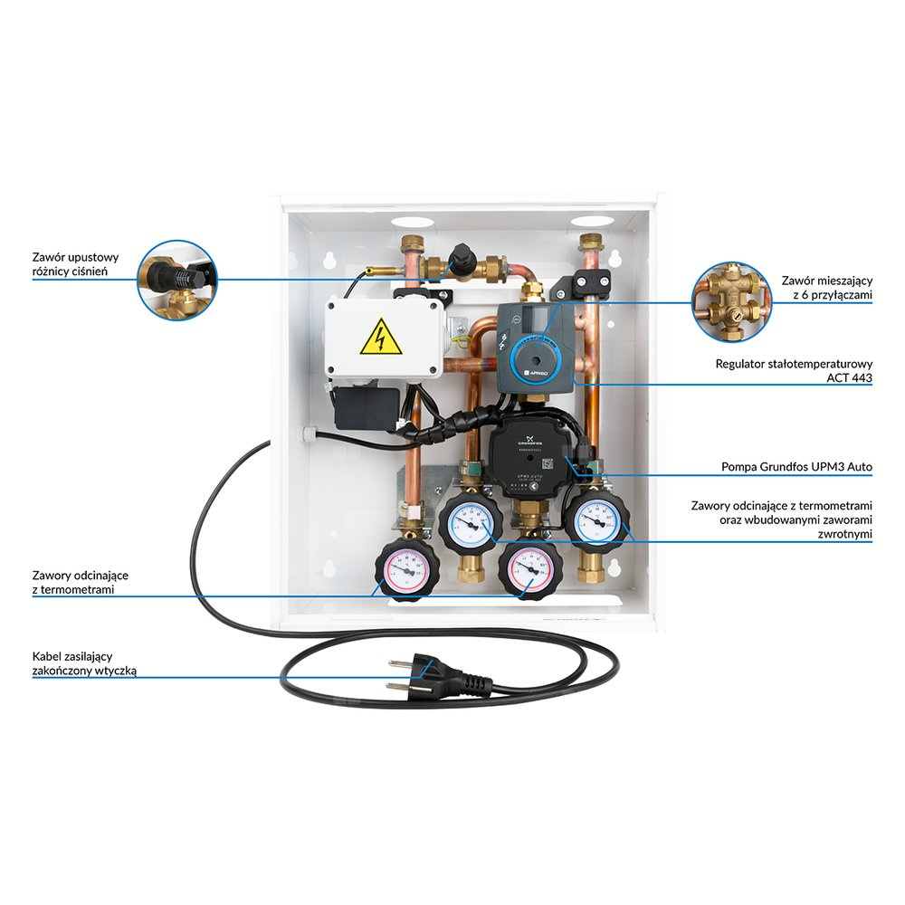 Zawór mieszający oraz pompa obiegowa sterowane są regulatorem stałotemperaturowym ACT 443 ProClick, który umożliwia regulację temperatury w zakresie od 10 do 90°C.