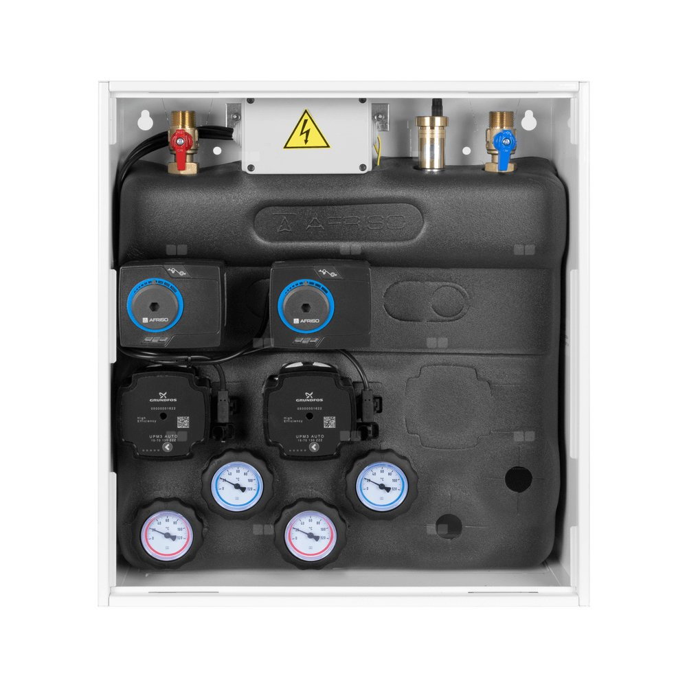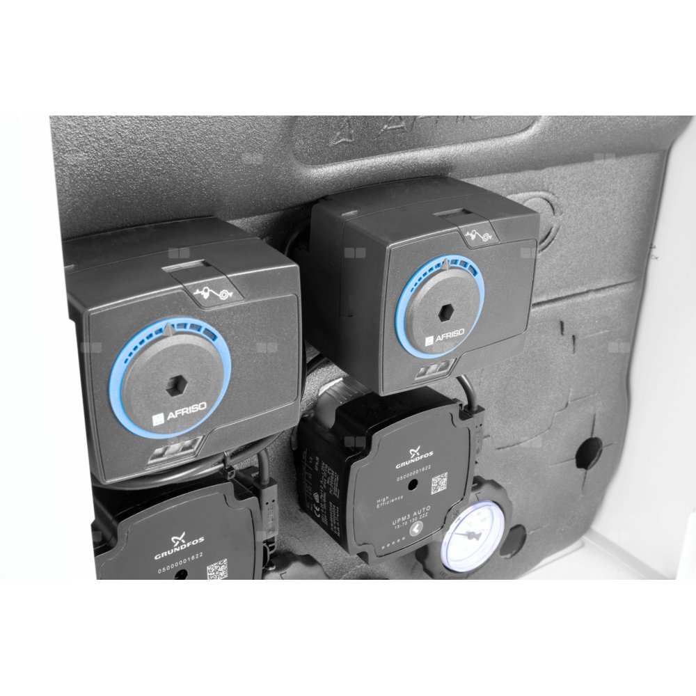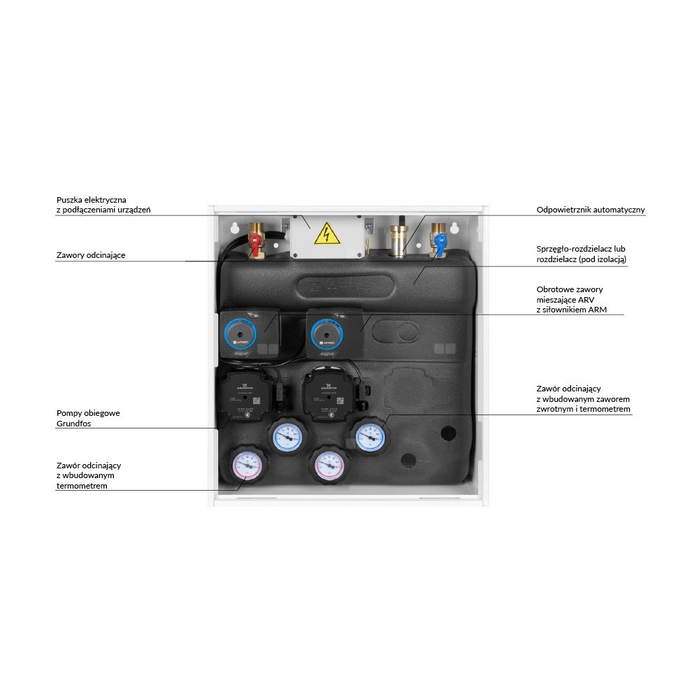 Wyposażony w pompy Grundfos UPm³ i zawory obrotowe z siłownikami elektrycznymi ARM 141.