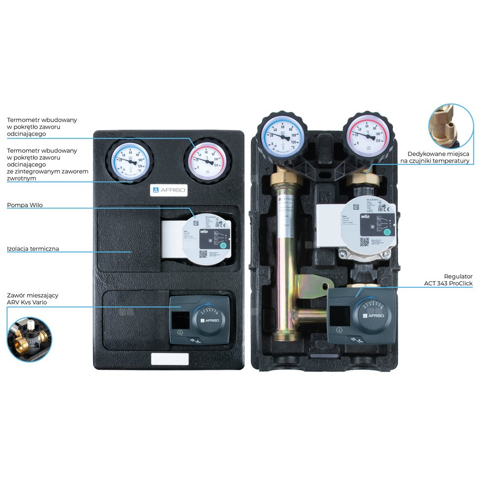 Wyposażona w niezbędne komponenty: termometry, zawór zwrotny, zawory odcinające na zasilaniu i powrocie oraz izolację termiczną.