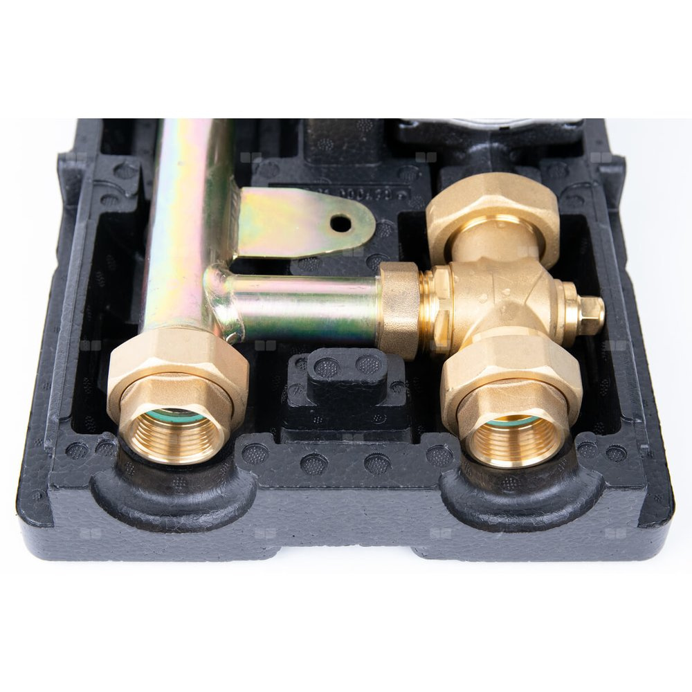 Wyposażona w niezbędne komponenty: termometry, zawór zwrotny, zawory odcinające na zasilaniu i powrocie, zawór odcinający przed pompą i izolację termiczną.