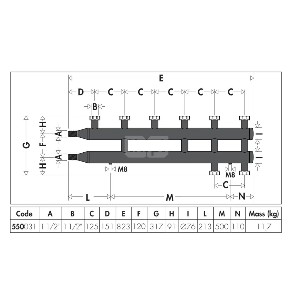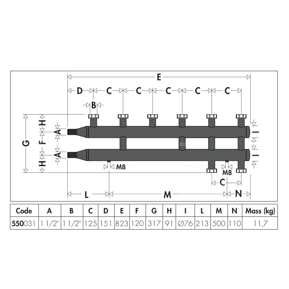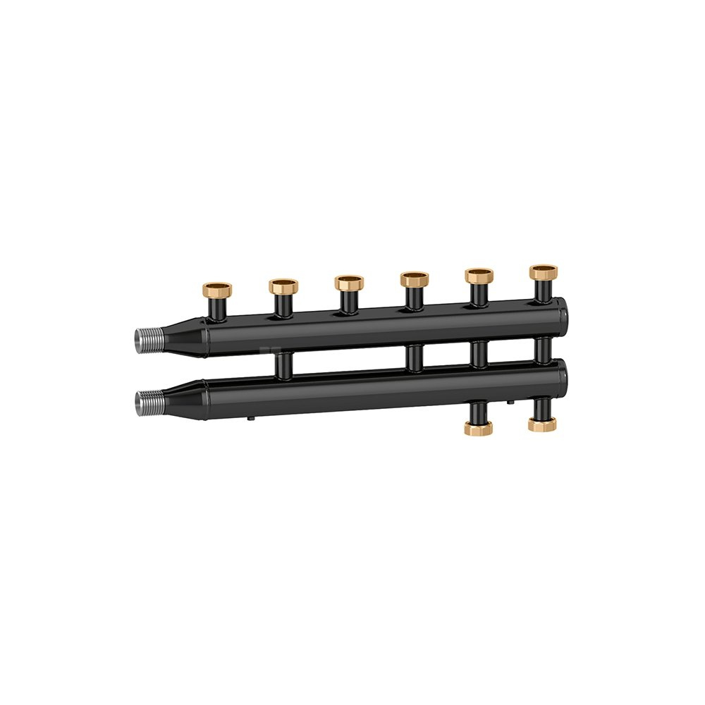 Rozdzielacz do instalacji grzewczych i chłodniczych. 3+1 wyjścia. główne podłączenie: G 1 1/2" A (ISO 228-1) GZ. przyłącza wylot: G 1 1/2" (ISO 228-1) GW, 3 wyjścia , nakrętka mocująca. Maksymalne ciśnienie pracy: 10 bar. Zakres temperatury medium: 5–110 °C. Rozstaw przyłączy głównych: 125 mm. Materiał: stal.